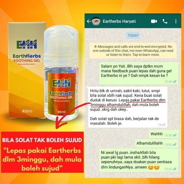 “Alhamdulillah sakit lutut dan semakin kurang selepas 5 hari amalkan Gel EARTHHERBS ni..”